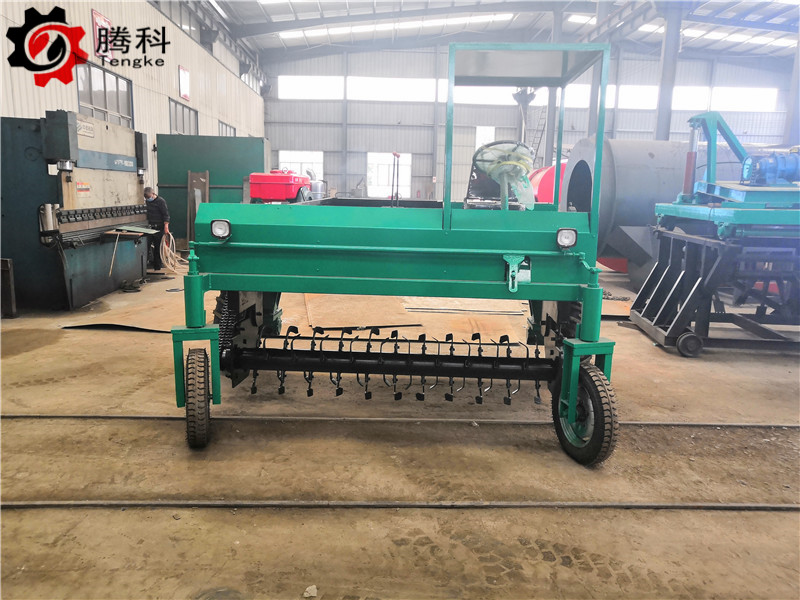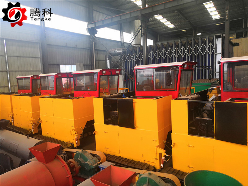 自走履带式有机肥发酵翻堆机的工作原理和组成结构:翻堆装置安装在整机底部,由液压马达驱动,完成翻堆装置的旋转。由于翻堆装置上的刀盘呈螺旋状布置,因此可在旋转过程中收集肥料。翻堆装置两端的材料被提升并收集到倾倒装置的中间。当翻堆装置切割器底座上的切割器运行时,肥料堆内的大块物料被粉碎、搅拌并抛到翻堆装置的后端。在施肥过程中,肥料与空气充分接触,肥料堆中多余的水分蒸发,发酵引起的高温降低,为好氧发酵微生物提供充足的氧气。